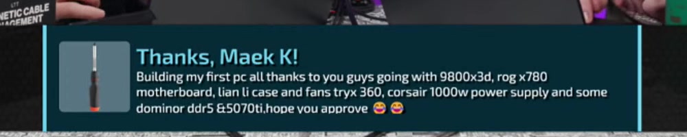 Maek K message Thanks, Maek K! Building my first pc all thanks to you guys going with 9800x3d, rog x780 motherboard, lian li case and fans tryx 360, corsair 1000w power supply and some dominor ddr5 &5070ti,hope you approve ☺☺ Timestamp