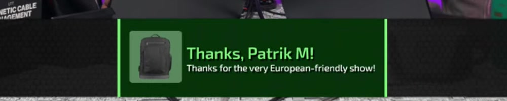 Patrik M message Thanks, Patrik M! Thanks for the very European-friendly show! Timestamp