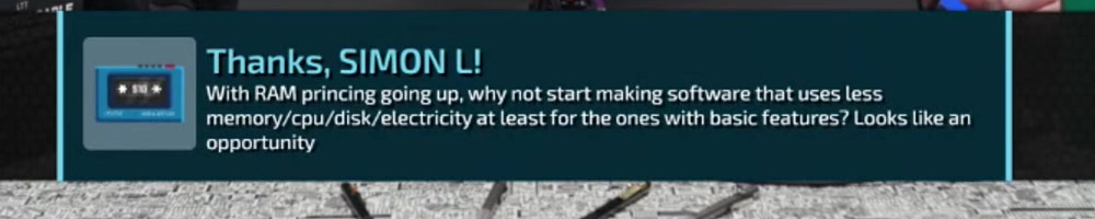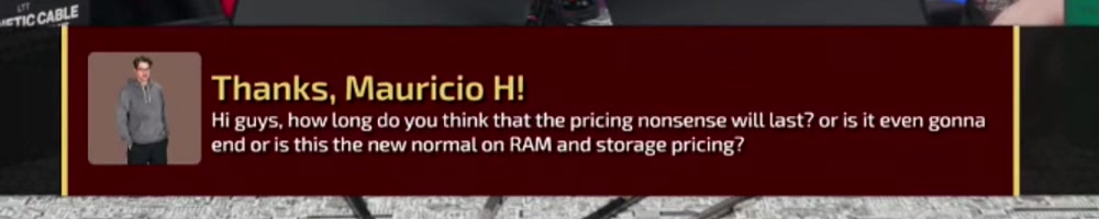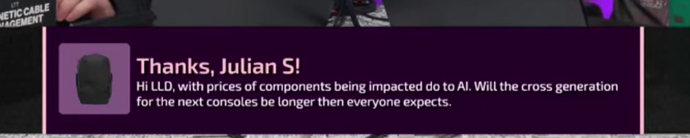 Julian S message Thanks, Julian S! Hi LLD, with prices of components being impacted do to Al. Will the cross generation for the next consoles be longer then everyone expects. Timestamp