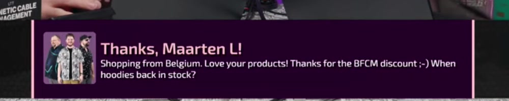 Maarten L message Thanks, Maarten L! Shopping from Belgium. Love your products! Thanks for the BFCM discount ;-) When hoodies back in stock? Timestamp