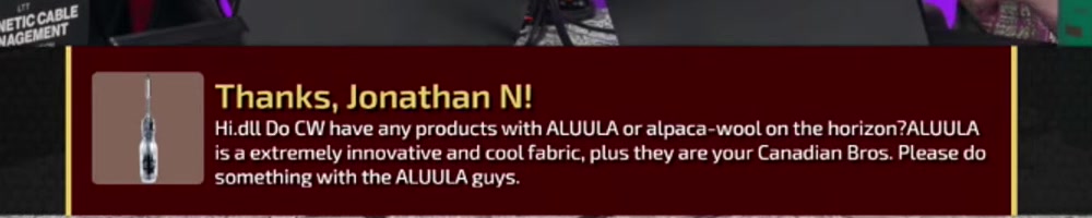 Jonathan N message Thanks, Jonathan N! Hi.dll Do CW have any products with ALUULA or alpaca-wool on the horizon?ALUULA is a extremely innovative and cool fabric, plus they are your Canadian Bros. Please do something with the ALUULA guys. Timestamp