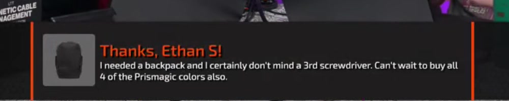 Ethan S message Thanks, Ethan S! I needed a backpack and I certainly don't mind a 3rd screwdriver. Can't wait to buy all 4 of the Prismagic colors also. Timestamp