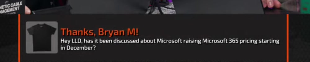 Bryan M message Thanks, Bryan M! Hey LLD, has it been discussed about Microsoft raising Microsoft 365 pricing starting in December? Timestamp