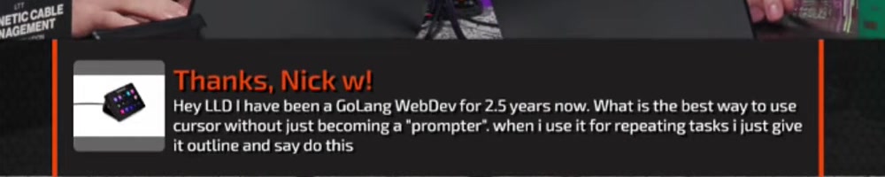 Nick w message Thanks, Nick w! Hey LLD I have been a Golang WebDev for 2.5 years now. What is the best way to use cursor without just becoming a "prompter". when i use it for repeating tasks i just give it outline and say do this Timestamp
