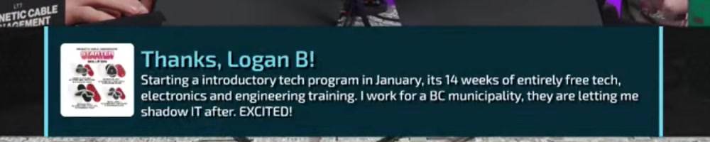 Logan B message Thanks, Logan B! Starting a introductory tech program in January, its 14 weeks of entirely free tech, electronics and engineering training. I work for a BC municipality, they are letting me shadow IT after. EXCITED! Timestamp