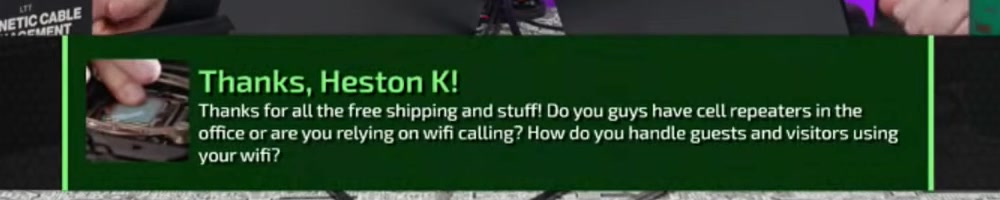 Heston K message Thanks, Heston K! Thanks for all the free shipping and stuff! Do you guys have cell repeaters in the office or are you relying on wifi calling? How do you handle guests and visitors using your wifi? Timestamp