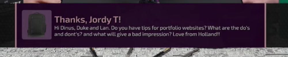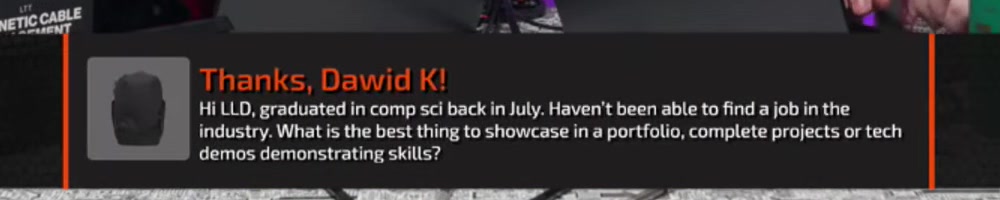 Dawid K message Thanks, Dawid K! Hi LLD, graduated in comp sci back in July. Haven't been able to find a job in the industry. What is the best thing to showcase in a portfolio, complete projects or tech demos demonstrating skills? Timestamp