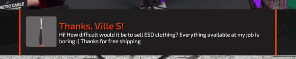 Ville S message Thanks, Ville S! Hi! How difficult would it be to sell ESD clothing? Everything available at my job is boring:(Thanks for free shipping Timestamp