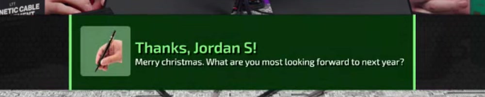 Jordan S message Thanks, Jordan S! Merry christmas. What are you most looking forward to next year? Timestamp