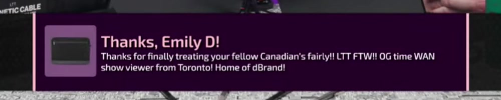 Emily D message Thanks, Emily D! Thanks for finally treating your fellow Canadian's fairly!! LTT FTW!! OG time WAN show viewer from Toronto! Home of dBrand! Timestamp