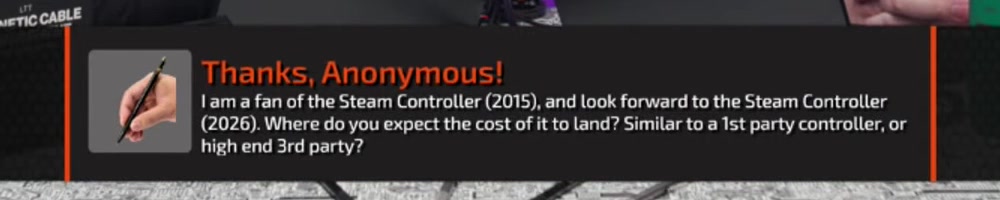 Anonymous message Thanks, Anonymous! I am a fan of the Steam Controller (2015), and look forward to the Steam Controller (2026). Where do you expect the cost of it to land? Similar to a 1st party controller, or high end 3rd party? Timestamp