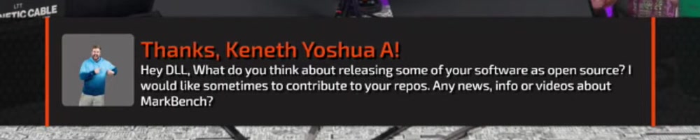 Keneth Yoshua A message Thanks, Keneth Yoshua A! Hey DLL, What do you think about releasing some of your software as open source? I would like sometimes to contribute to your repos. Any news, info or videos about MarkBench? Timestamp