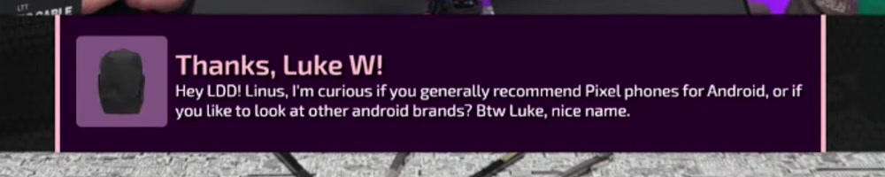 Luke W message Thanks, Luke W! Hey LDD! Linus, I'm curious if you generally recommend Pixel phones for Android, or if you like to look at other android brands? Btw Luke, nice name. Timestamp