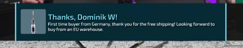 Dominik W message Thanks, Dominik W! First time buyer from Germany, thank you for the free shipping! Looking forward to buy from an EU warehouse. Timestamp