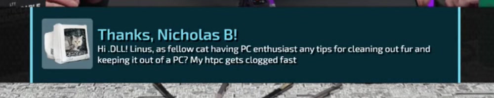 Nicholas B message Thanks, Nicholas B! Hi .DLL! Linus, as fellow cat having PC enthusiast any tips for cleaning out fur and keeping it out of a PC? My htpc gets clogged fast Timestamp
