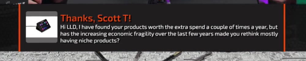Scott T message Thanks, Scott T! Hi LLD, I have found your products worth the extra spend a couple of times a year, but has the increasing economic fragility over the last few years made you rethink mostly having niche products? Timestamp