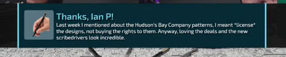lan P message Thanks, lan P! Last week I mentioned about the Hudson's Bay Company patterns, I meant *license* the designs, not buying the rights to them. Anyway, loving the deals and the new scribedrivers look incredible. Timestamp