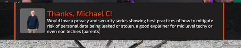 Michael C message Thanks, Michael C! Would love a privacy and security series showing best practices of how to mitigate risk of personal data being leaked or stolen. a good explainer for mid level techy or even non techies (parents) Timestamp