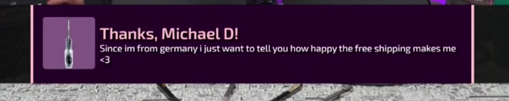 Michael D message Thanks, Michael D! Since im from germany i just want to tell you how happy the free shipping makes me <3 Timestamp