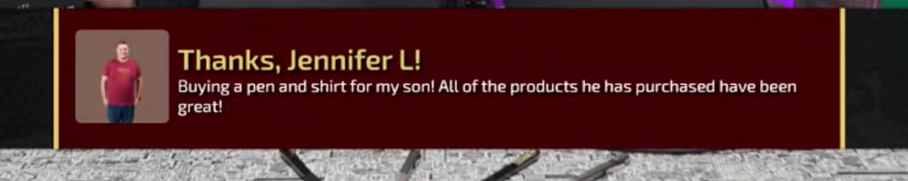 Jennifer L message Thanks, Jennifer L! Buying a pen and shirt for my son! All of the products he has purchased have been great! Timestamp
