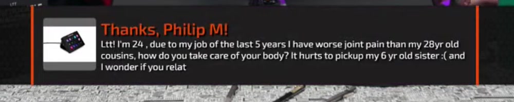 Philip M message Thanks, Philip M! Ltt! I'm 24, due to my job of the last 5 years I have worse joint pain than my 28yr old cousins, how do you take care of your body? It hurts to pickup my 6 yr old sister :( and I wonder if you relat Timestamp