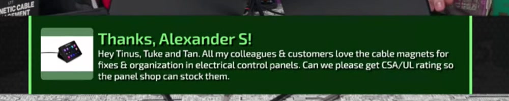 Alexander S message Thanks, Alexander S! Hey Tinus, Tuke and Tan. All my colleagues & customers love the cable magnets for fixes & organization in electrical control panels. Can we please get CSA/UL rating so the panel shop can stock them. Timestamp
