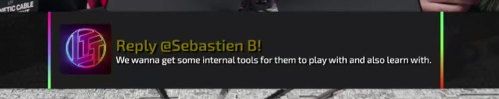Sebastien B reply Reply @Sebastien B! We wanna get some internal tools for them to play with and also learn with. Timestamp