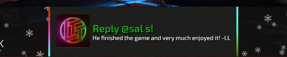 He finished the game and very much enjoyed it! -LL | Timestamp |  |