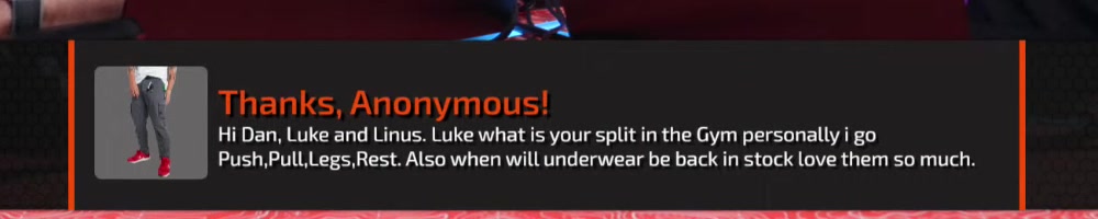 Hi Dan, Luke and Linus. Luke what is your split in the Gym personally i go