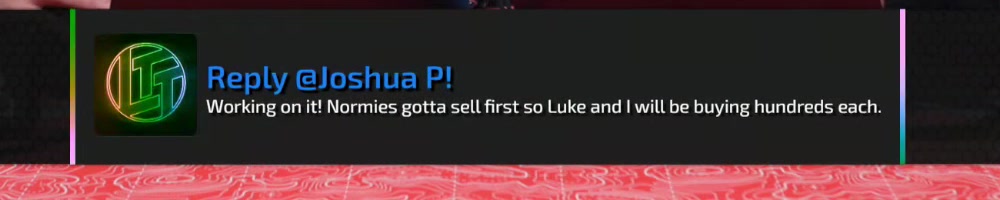 Working on it! Normies gotta sell first so Luke and I will be buying hundreds each. | Timestamp |  |