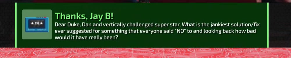 Dear Duke, Dan and vertically challenged super star, What is the jankiest solution/fix