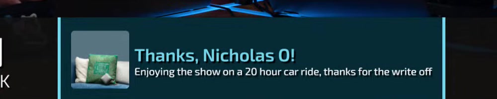 Enjoying the show on a 20 hour car ride, thanks for the write off | Timestamp |  |