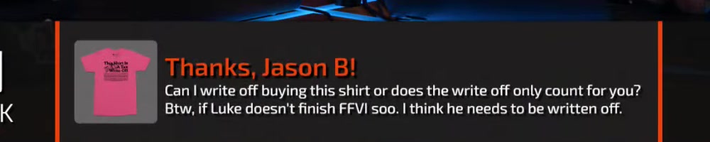 Btw, if Luke doesn't finish FFVI soo. I think he needs to be written off. | Timestamp |  |
