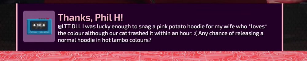 @LTT.DLL I was lucky enough to snag a pink potato hoodie for my wife who *loves*