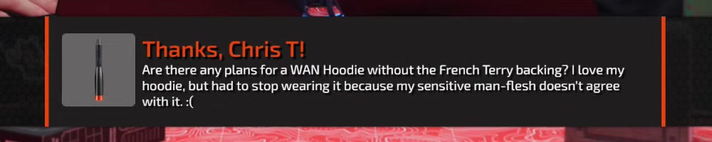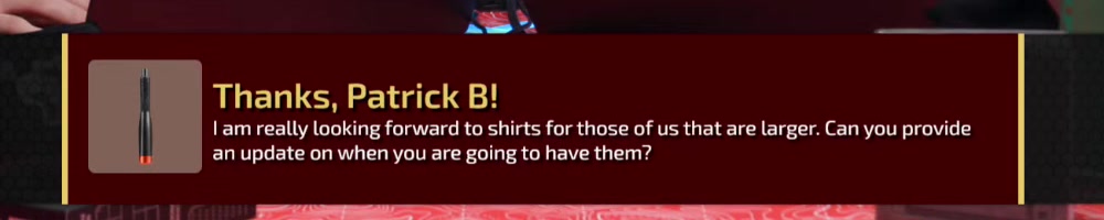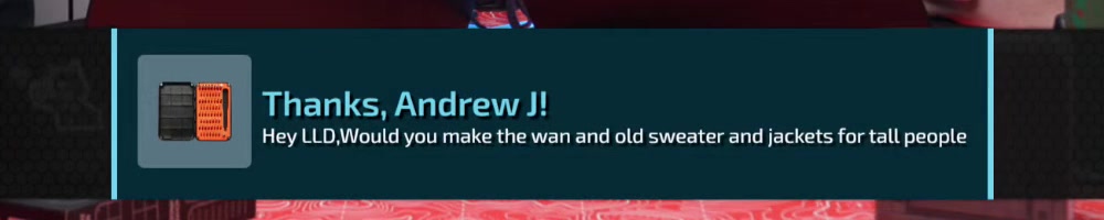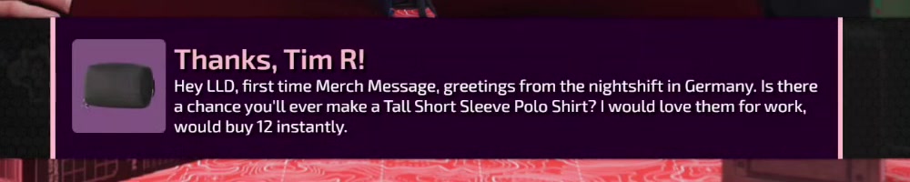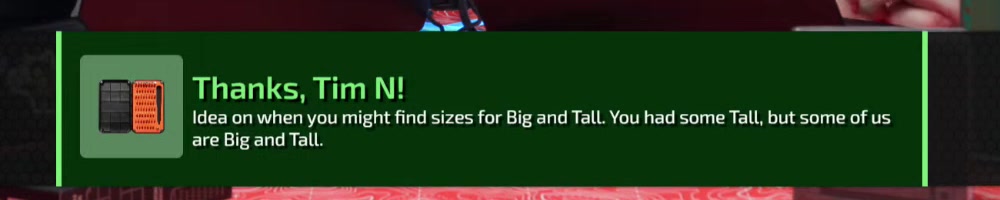 Hey DLL, any more tall versions of the apparel coming soon for Luke Dan and I? | Timestamp |  |
