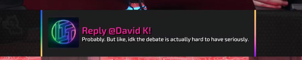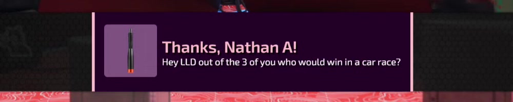 Hey LLD out of the 3 of you who would win in a car race? | Timestamp |  |