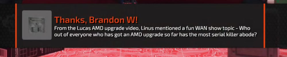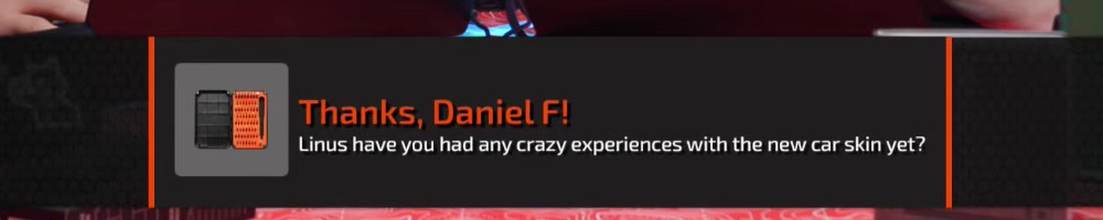 Linus have you had any crazy experiences with the new car skin yet? | Timestamp |  |