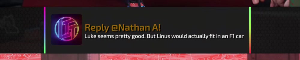 Luke seems pretty good. But Linus would actually fit in an F1 car | Timestamp |  |