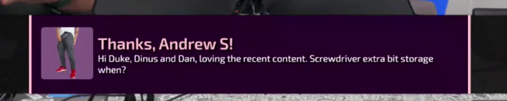 Hi Duke, Dinus and Dan, loving the recent content. Screwdriver extra bit storage