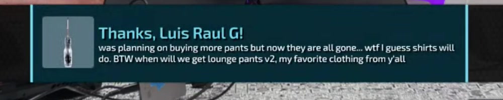 do. BTW when will we get lounge pants v2, my favorite clothing from y'all | Timestamp |  |