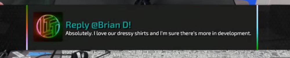 Absolutely. I love our dressy shirts and I'm sure there's more in development. | Timestamp |  |