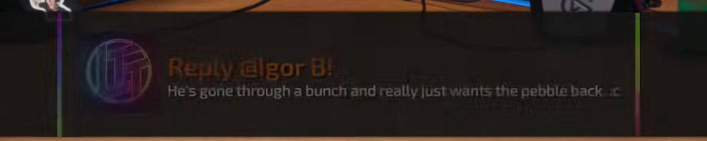 He's gone through a bunch and really just wants the pebble back c | Timestamp |  |