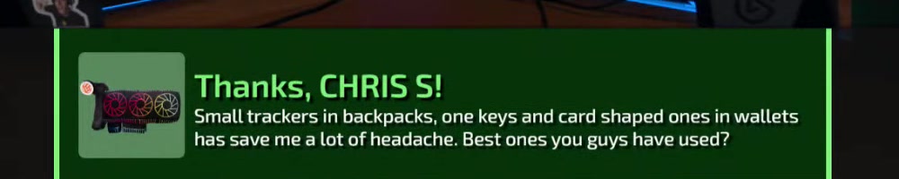Small trackers in backpacks, one keys and card shaped ones in wallets
