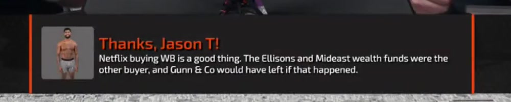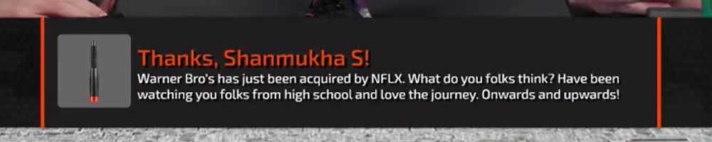 Shanmukha S message Thanks, Shanmukha S! Warner Bro's has just been acquired by NFLX. What do you folks think? Have been watching you folks from high school and love the journey. Onwards and upwards! Timestamp