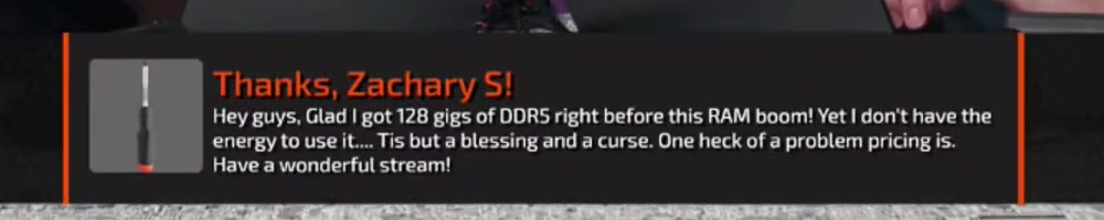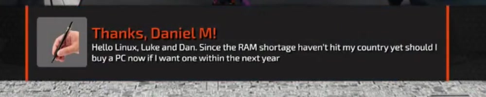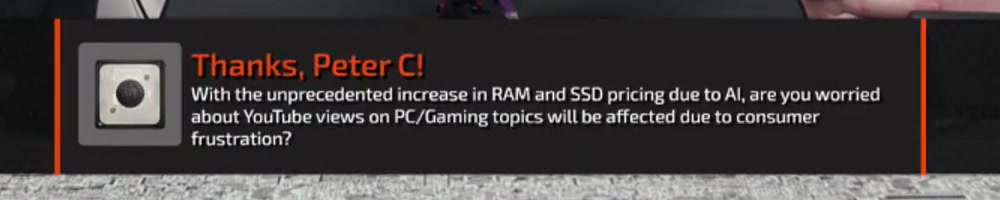 Peter C message Thanks, Peter C! With the unprecedented increase in RAM and SSD pricing due to Al, are you worried about YouTube views on PC/Gaming topics will be affected due to consumer frustration? Timestamp