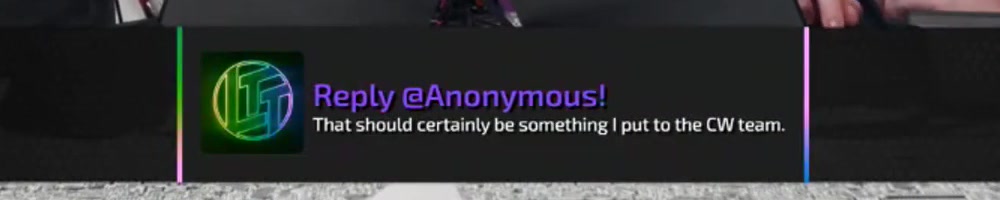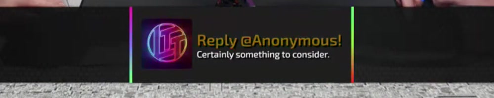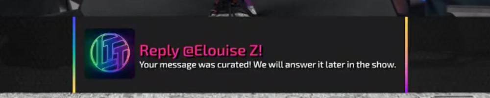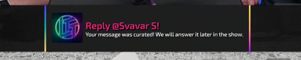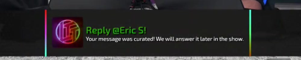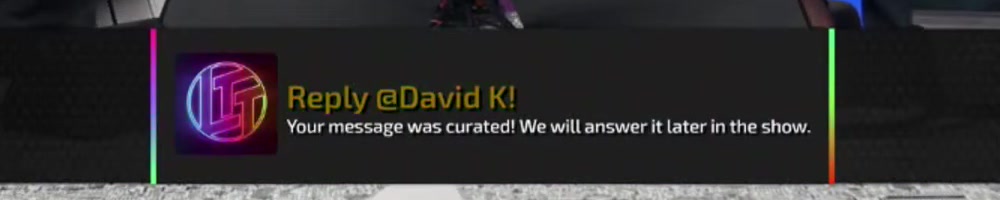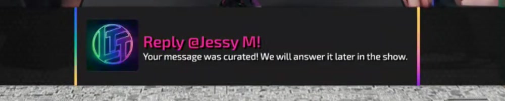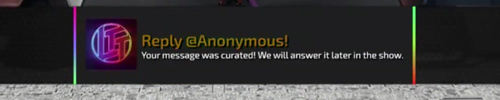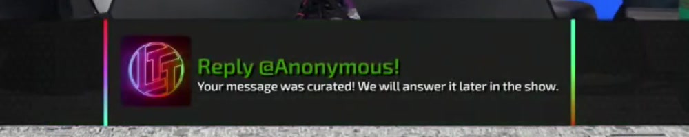 Anonymous reply Reply @Anonymous! Your message was curated! We will answer it later in the show. Timestamp