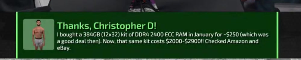 Christopher D message Thanks, Christopher D! I bought a 384GB (12x32) kit of DDR4 2400 ECC RAM in January for -$250 (which was a good deal then). Now, that same kit costs $2000-$2900!! Checked Amazon and eBay. Timestamp