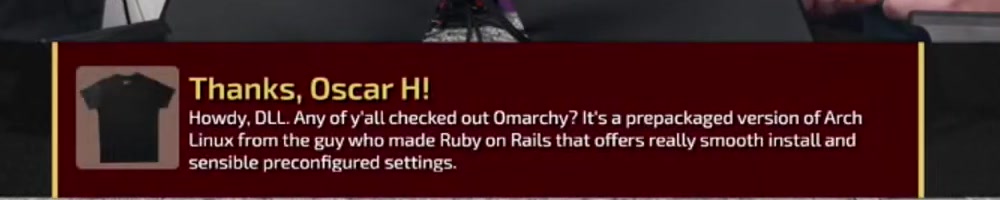 Oscar H message Thanks, Oscar H! Howdy, DLL. Any of y'all checked out Omarchy? It's a prepackaged version of Arch Linux from the guy who made Ruby on Rails that offers really smooth install and sensible preconfigured settings. Timestamp