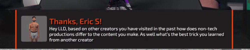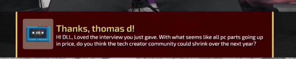 thomas d message Thanks, thomas d! HI DLL, Loved the interview you just gave. With what seems like all pc parts going up in price, do you think the tech creator community could shrink over the next year? Timestamp