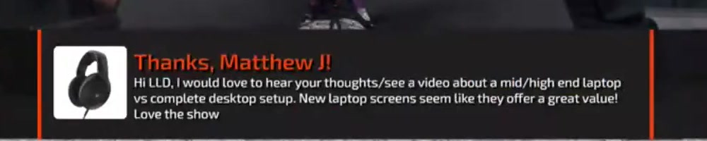 Matthew J message Thanks, Matthew J! Hi LLD, I would love to hear your thoughts/see a video about a mid/high end laptop vs complete desktop setup. New laptop screens seem like they offer a great value! Love the show Timestamp